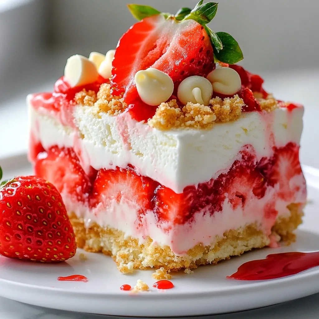 Jetzt bauen wir die Eisriegel zusammen. Nimm eine rechteckige Backform und lege sie mit Backpapier aus. Verteile die Hälfte der zerbröselten Shortcake-Kekse gleichmäßig auf dem Boden. Gieße die erste Hälfte der Erdbeer-Sahne-Mischung darüber und streiche sie glatt. Streue die restlichen Kekse darüber. Gieße dann die restliche Erdbeer-Sahne-Mischung darauf. Wenn du magst, streue 1/2 Tasse weiße Schokoladenstückchen obendrauf und drücke sie leicht ein. Decke die Form mit Frischhaltefolie ab. Stelle sie für mindestens 4 bis 6 Stunden ins Gefrierfach, bis sie fest ist. Nach dem Gefrieren, lasse die Form 5 Minuten draußen. So kannst du die Riegel leichter schneiden. Schneide sie in Stücke und genieße sie sofort oder bewahre sie für später auf.