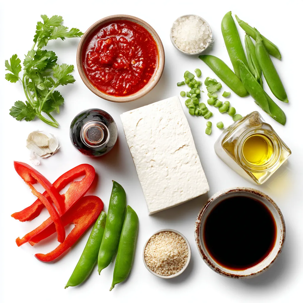 Die Hauptzutaten machen dieses Gericht lecker und bunt. Tofu ist eine großartige Proteinquelle. Paprika bringt Farbe und Süße. Zuckerschoten fügen eine knackige Textur hinzu.