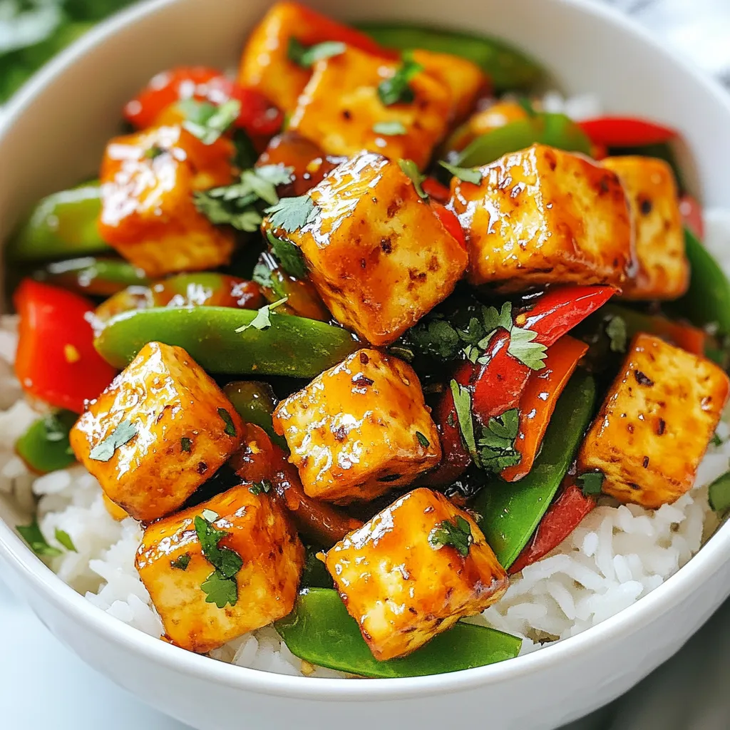 - 1 Block (400 g) fester Tofu, gepresst und gewürfelt - 1 rote Paprika, in Streifen geschnitten - 1 grüne Paprika, in Streifen geschnitten - 1 Tasse Zuckerschoten, geputzt Die Hauptzutaten machen dieses Gericht lecker und bunt. Tofu ist eine großartige Proteinquelle. Paprika bringt Farbe und Süße. Zuckerschoten fügen eine knackige Textur hinzu. - 4 Knoblauchzehen, fein gehackt - 1 Esslöffel frischer Ingwer, gerieben - 60 ml süße Chilisauce - 30 ml Sojasauce (reduzierter Natriumgehalt) - 15 ml Reisessig - 5 ml Sesamöl - Salz und Pfeffer nach Geschmack Die Gewürze und Saucen geben dem Gericht seinen besonderen Geschmack. Knoblauch und Ingwer sorgen für Aroma. Süße Chilisauce bringt die richtige Schärfe. Sojasauce und Reisessig fügen Tiefe hinzu. - Gekochter Jasminreis zum Servieren - Frischer Koriander zur Garnitur (optional) Ich empfehle, dieses Gericht mit Jasminreis zu servieren. Der Reis nimmt die Saucen gut auf. Frischer Koriander bringt einen frischen Kick. Das macht die Präsentation schöner und das Essen leckerer. {{ingredient_image_2}} Zuerst drücke den Tofu, um die Feuchtigkeit zu entfernen. Wickel den Tofu in ein sauberes Küchentuch. Lege einen schweren Gegenstand darauf. Lass ihn für 15 bis 20 Minuten stehen. Der Tofu wird fester und besser zum Braten. Nach dem Pressen schneide den Tofu in 2,5 cm große Würfel. Gib die Würfel in eine Schüssel und vermenge sie mit 2 Esslöffeln Maisstärke. Achte darauf, dass alle Stücke gut bedeckt sind. Dies macht den Tofu knusprig. Erhitze 1 Esslöffel Pflanzenöl in einer großen Pfanne oder einem Wok. Stelle die Hitze auf mittel bis hoch. Füge die gewürfelten Tofu-Stücke in einer einzigen Schicht hinzu. Brate sie 8 bis 10 Minuten, bis sie von allen Seiten goldbraun sind. Nimm die Tofu-Stücke aus der Pfanne und lege sie beiseite. Das Braten gibt dem Tofu eine schöne Textur und Farbe. In derselben Pfanne gib das restliche Esslöffel Öl hinzu. Lass das Öl heiß werden. Füge die geschnittenen roten und grünen Paprika sowie die Zuckerschoten hinzu. Brate das Gemüse 3 bis 4 Minuten lang. Es soll zart, aber lebhaft bleiben. Dann füge den fein gehackten Knoblauch und den geriebenen Ingwer hinzu. Brate diese Mischung für eine weitere Minute. Das gibt dem Gemüse einen tollen Geschmack. Jetzt kommt der spannende Teil. Gib den gebräunten Tofu zurück in die Pfanne. Füge die süße Chilisauce, Sojasauce, Reisessig und Sesamöl hinzu. Vermenge alles vorsichtig. Lass die Mischung 2 bis 3 Minuten erwärmen. Schmecke das Gericht ab und füge nach Bedarf Salz und Pfeffer hinzu. Diese Sauce verbindet alle Aromen und macht das Gericht besonders lecker. Um Tofu gut zuzubereiten, drücken Sie ihn richtig. Wickeln Sie den Tofu in ein Küchentuch. Legen Sie dann ein schweres Objekt darauf. So entfernen Sie die Feuchtigkeit. Lassen Sie ihn 15 bis 20 Minuten ruhen. Danach schneiden Sie ihn in gleich große Würfel, etwa 2,5 cm groß. Bestäuben Sie die Tofu-Würfel mit Maisstärke. Diese gibt dem Tofu eine knusprige Textur. Braten Sie den Tofu in einer heißen Pfanne mit Pflanzenöl. Achten Sie darauf, dass die Würfel nicht übereinander liegen. Braten Sie sie 8 bis 10 Minuten, bis sie goldbraun sind. Das gibt dem Tofu Geschmack und eine schöne Farbe. Für dieses Rezept können Sie viele verschiedene Gemüse verwenden. Rote und grüne Paprika sind großartig. Sie bringen Farbe und Geschmack. Zuckerschoten sind knackig und süß. Brokkoli, Karotten oder auch Champignons sind ebenfalls empfehlenswert. Seien Sie kreativ! Sie können auch saisonales Gemüse verwenden. Das macht Ihr Gericht frisch und bunt. Möchten Sie es milder? Dann verwenden Sie weniger süße Chilisauce. Fügen Sie stattdessen etwas mehr Sojasauce hinzu. Für mehr Schärfe können Sie frische Chilis oder Chili-Pulver einstreuen. Probieren Sie einfach aus, was Ihnen am besten schmeckt. So wird Ihre Tofu-Pfanne genau nach Ihrem Geschmack! Pro Tipps Tofu richtig pressen: Stellen Sie sicher, dass der Tofu gut gepresst ist, um überschüssige Flüssigkeit zu entfernen. Dies hilft, eine bessere Textur und Geschmack zu erzielen. Variationen bei Gemüse: Experimentieren Sie mit verschiedenen Gemüsesorten wie Brokkoli oder Karotten, um unterschiedliche Geschmäcker und Texturen zu erhalten. Schärfe anpassen: Passen Sie die Menge der süßen Chilisauce an, um den gewünschten Schärfegrad zu erreichen. Für weniger Schärfe verwenden Sie weniger Sauce. Frische Kräuter nutzen: Garnieren Sie das Gericht mit frischem Koriander oder Frühlingszwiebeln, um einen zusätzlichen Frischekick und Farbkontrast zu verleihen. {{image_4}} Für eine vegane Variante dieser Tofu-Pfanne kann man verschiedene Proteinquellen nutzen. Kichererbsen oder Linsen passen gut. Diese Optionen sind auch nahrhaft und lecker. Sie bieten eine gute Textur und Geschmack. Probieren Sie sie aus, um Abwechslung zu schaffen. Wenn Sie glutenfrei essen, ersetzen Sie die Sojasauce durch Tamari. Tamari hat einen ähnlichen Geschmack, ist aber glutenfrei. Dies sorgt dafür, dass das Gericht für alle sicher bleibt. Achten Sie darauf, die richtige Marke zu wählen. Um das Gemüse in der Pfanne aufzupeppen, können Sie mehr Zutaten hinzufügen. Brokkoli, Karotten oder Zucchini sind tolle Optionen. Sie bringen Farbe und Nährstoffe in das Gericht. Experimentieren Sie mit verschiedenen Gemüsesorten, um Ihre Lieblingskombination zu finden. Um die Frische der Tofu-Pfanne zu bewahren, lagere sie in einem luftdichten Behälter. Lass das Gericht abkühlen, bevor du es in den Kühlschrank stellst. So bleibt der Tofu zart und das Gemüse knackig. Es bleibt etwa drei bis vier Tage frisch. Möchtest du Reste aufbewahren? Das Einfrieren ist eine gute Option. Lass die Tofu-Pfanne zuerst abkühlen. Fülle sie dann in einen gefrierfesten Behälter. Achte darauf, Platz für die Ausdehnung zu lassen. So bleibt die Qualität erhalten. Du kannst die Pfanne bis zu drei Monate einfrieren. Um die Tofu-Pfanne wieder aufzuwärmen, be
