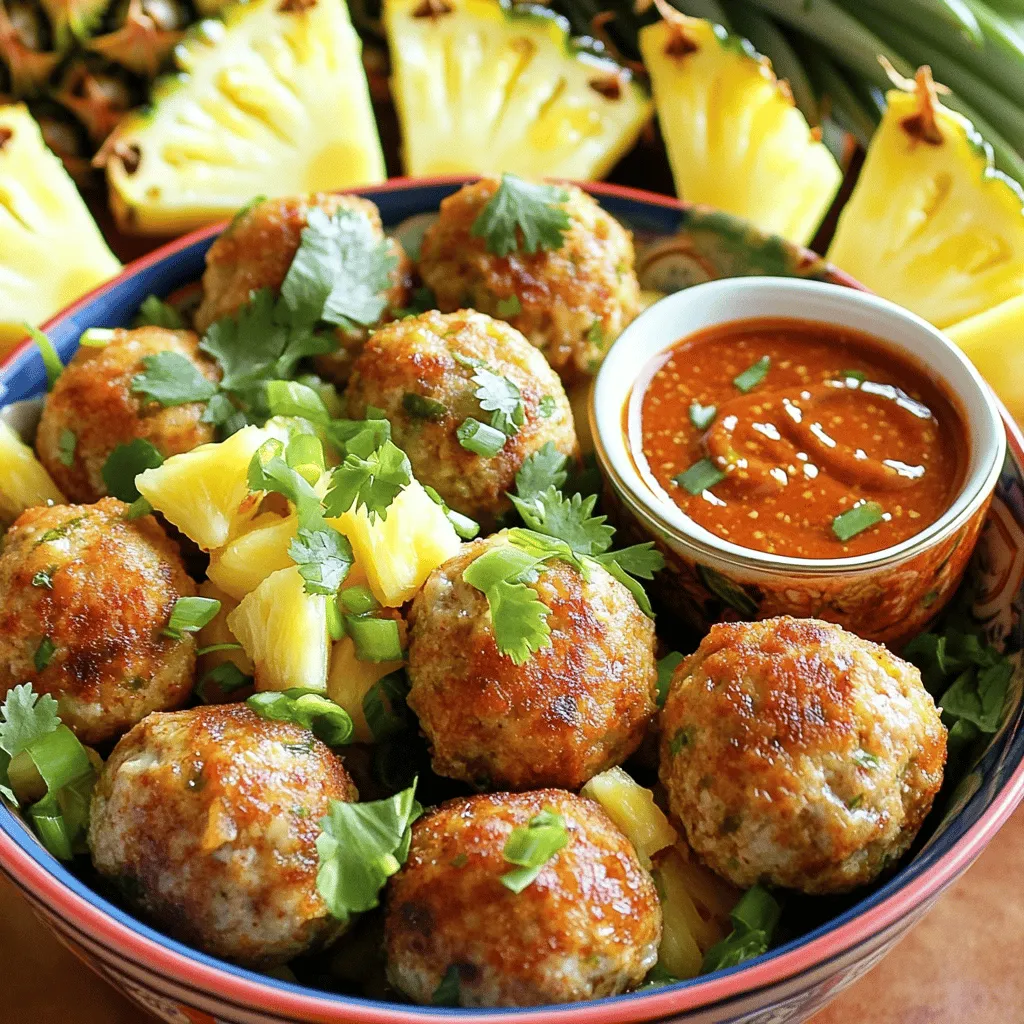 - Präsentationstipps: Servieren Sie die Fleischbällchen in einer festlichen Schüssel, garnieren Sie sie mit frischem Koriander und stellen Sie Spieße für ein einfaches Servieren bereit. Optional können Sie Ananasstücke rund um die Schüssel anrichten, um einen attraktiven Mittelpunkt zu schaffen.