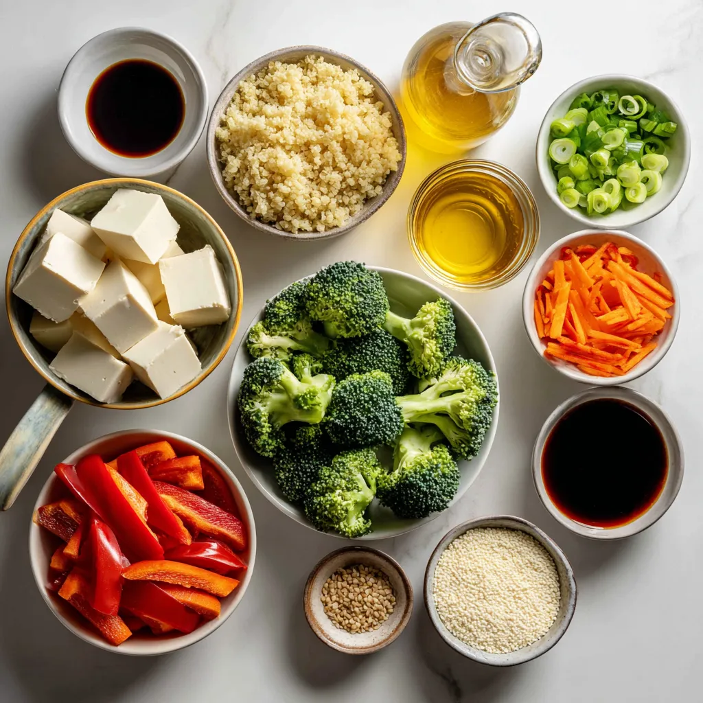 Die Hauptzutaten sind einfach und gesund. Tofu bietet eine tolle Proteinquelle. Quinoa ist nahrhaft und glutenfrei. Ihr Gemüse bringt Farbe und Knusprigkeit in das Gericht. Brokkoli, Paprika und Karotte machen die Schüssel bunt und lecker.