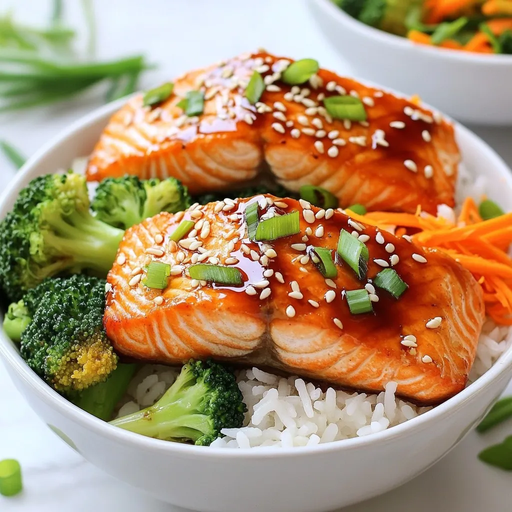 Bowl Zusammenstellen: Lockere den gekochten Jasminreis mit einer Gabel auf und verteile ihn auf Servierschalen. Lege je ein Lachsfilet auf jede Bowl und träufele die restliche Teriyaki-Sauce über den Lachs.