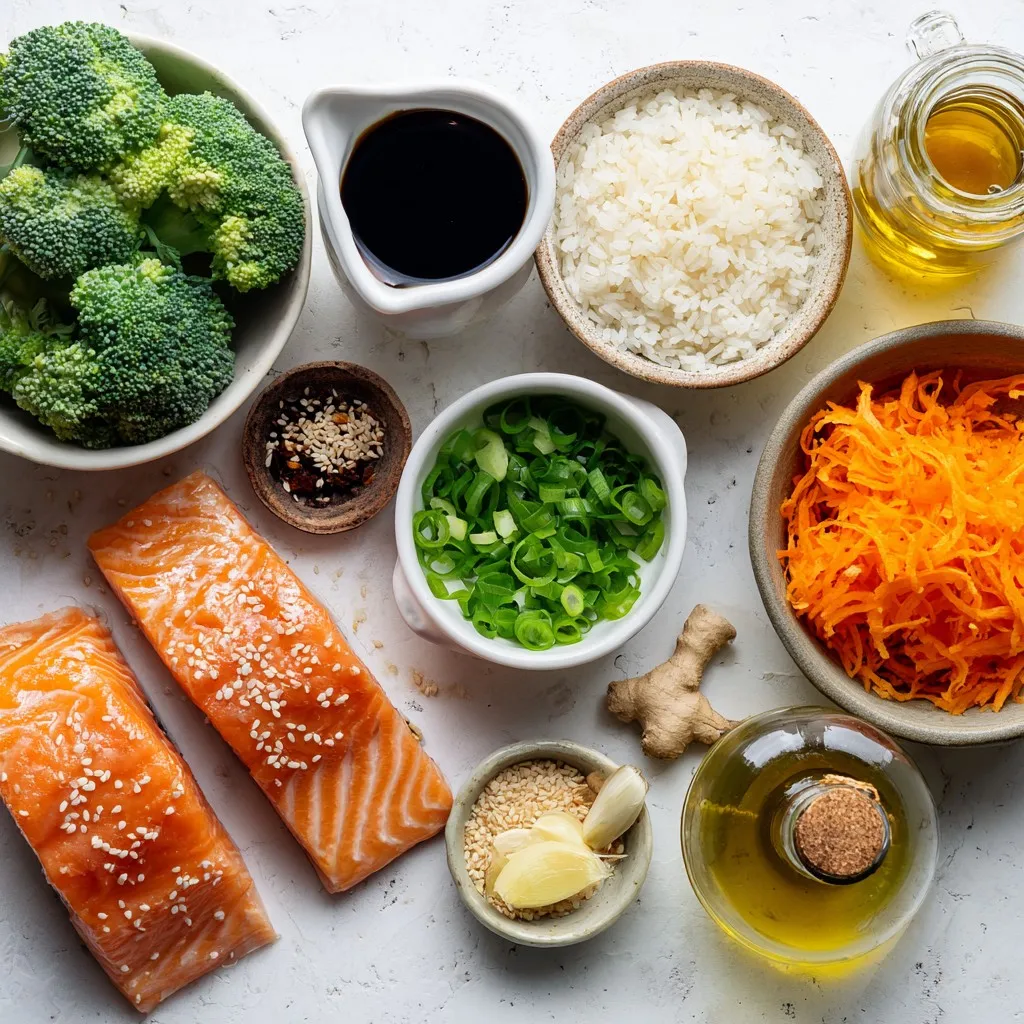 Lachs ist reich an Omega-3-Fettsäuren. Diese Fette sind gut für das Herz. Jasminreis liefert schnelle Energie dank der Kohlenhydrate. Brokkoli ist voll mit Vitaminen und Mineralstoffen. Karotten sind eine tolle Quelle für Beta-Carotin, das gut für die Augen ist. Die Sojasoße bringt Geschmack und umami, aber schau auf den Salzgehalt.