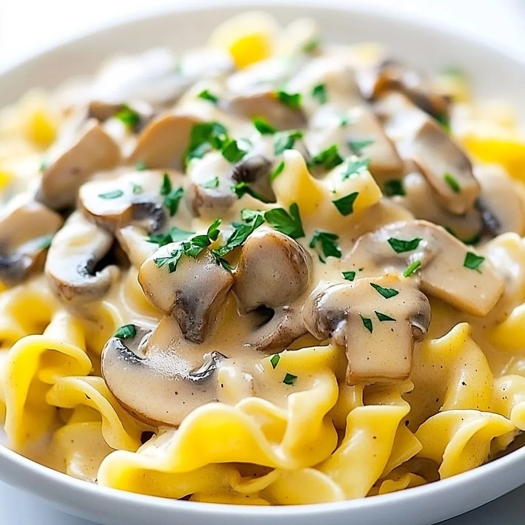 Ein köstliches und cremiges veganes Gericht mit Pilzen und breiten Nudeln.
