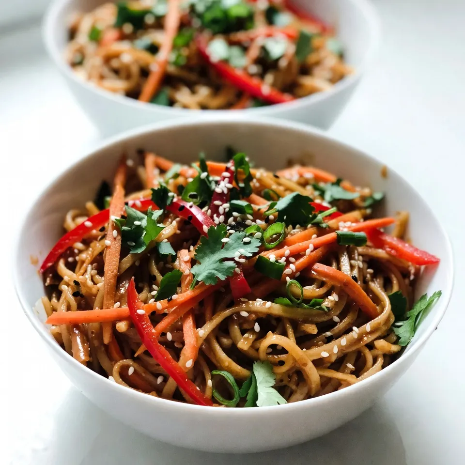 Ein schmackhaftes Nudelgericht mit einer würzigen Sesamsauce und frischem Gemüse.